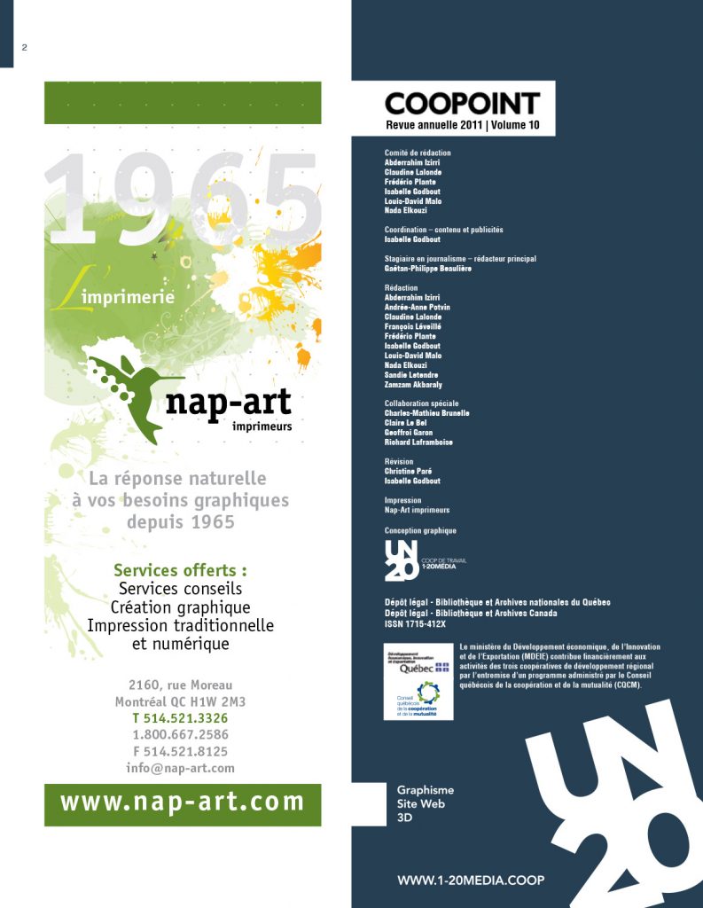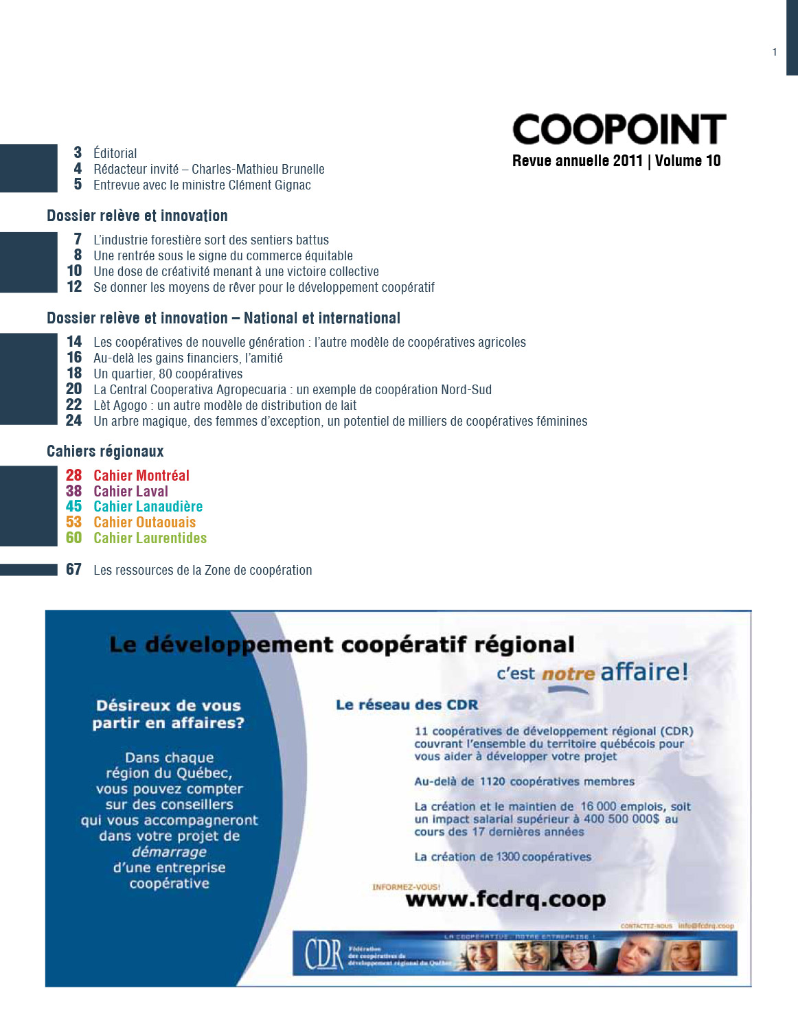 Laval. Qui aurait cru que nous atteindrions le cap de la dixième année ? La CDR Montréal-Laval a produit seule les quatre premières parutions. La revue a ensuite été développée conjointement avec ses voisines, la Coopérative de développement régional (CDR) de Lanaudière et la Coopérative de développement régional (CDR) Outaouais- Laurentides, par l’entremise de la Zone de coopération. La revue Coopoint est un outil important dans la réalisation de la mission des trois CDR, à savoir la promotion de la coopération et de l’intercoopération sur leur territoire respectif.