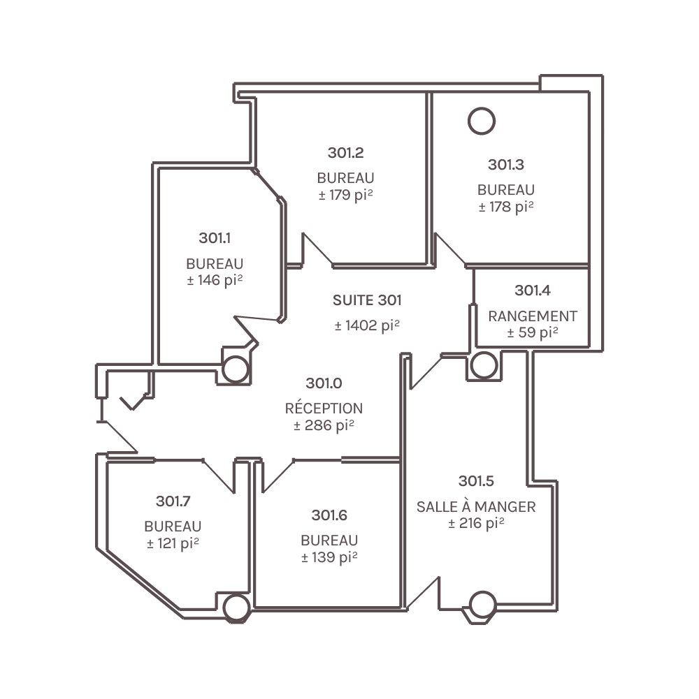 La suite 301 offre un espace de travail fonctionnel et bien divisé, idéal pour une entreprise en croissance. Ses cinq bureaux fermés assurent intimité et concentration, tandis que l’espace d’accueil permet de recevoir clients et partenaires dans un cadre professionnel. Un espace de rangement et une salle à manger complètent l’aménagement, pour un environnement de travail efficace et agréable.